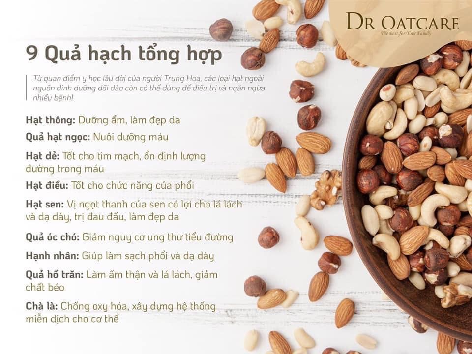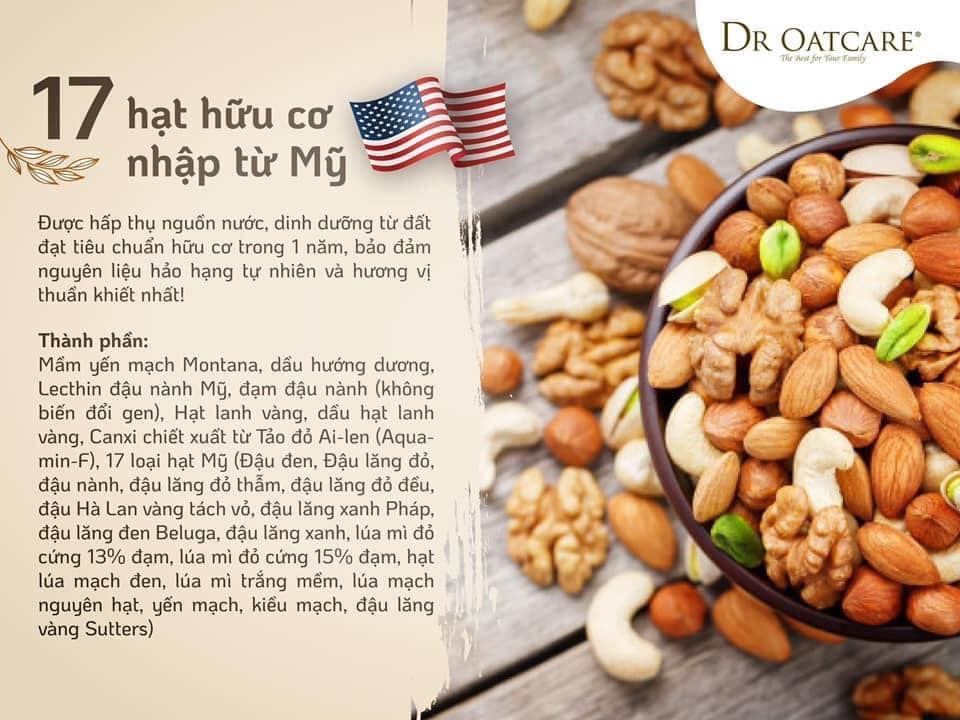 ✅DR OATCARE gồm các thành phần tự nhiên bao gồm 17 hạt hữu cơ, 9 loại hạt bổ sung, thu hoạch và sản xuất trong thời gian dinh dưỡng vàng của yến mạch, khi yến mạch có nhiều chất xơ và protein nhất, có hàm lượng canxi cao từ tảo đỏ Ireland (Aquamin -F), hạnh nhân, hạt lanh, lúa mì nguyên hạt và các loại hạt khác.